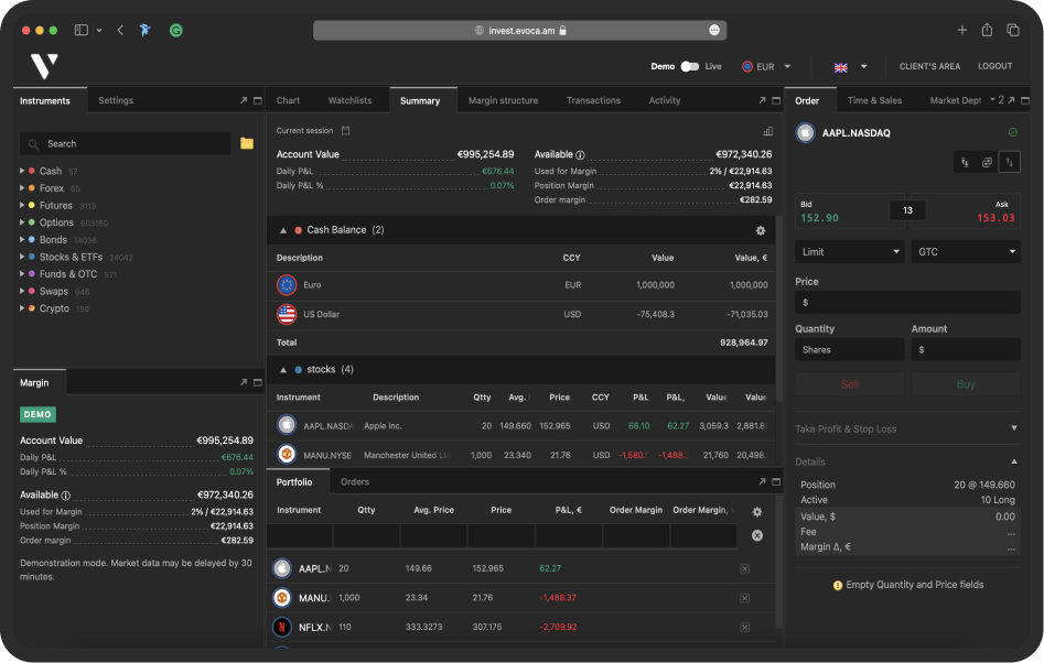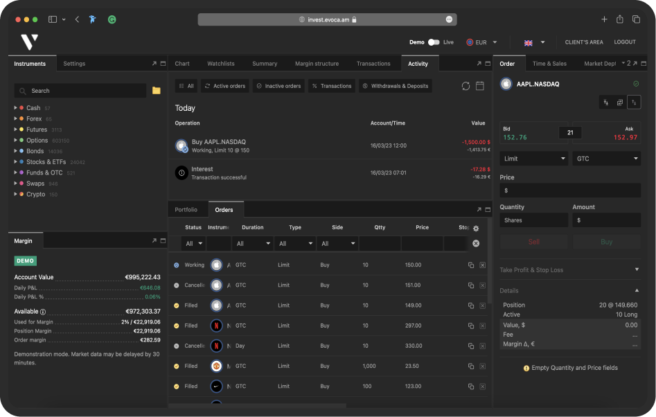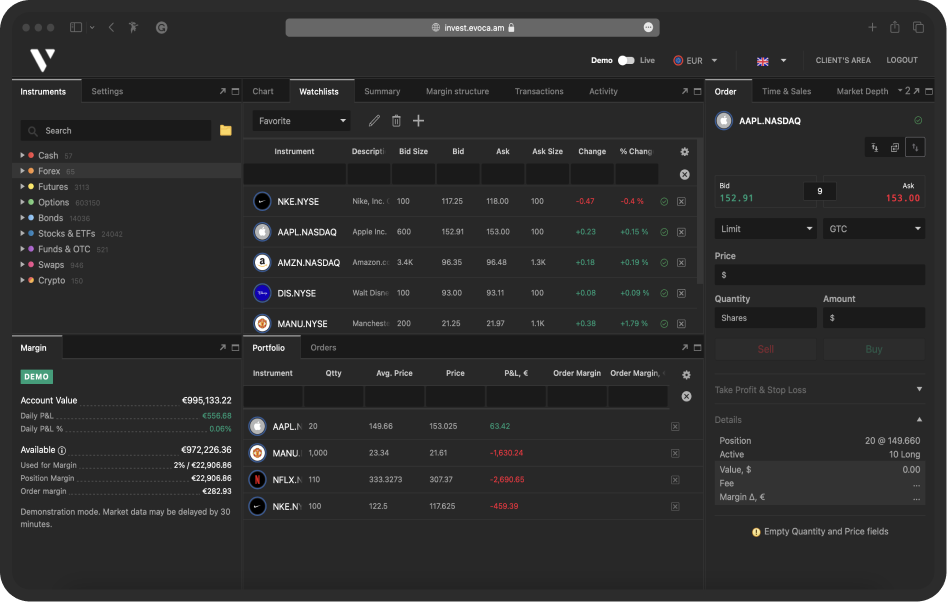 Համալրելով Evocabank-ում Ձեր Բրոքերային հաշիվը` կարող եք օգտվել մեր ներդրումային ծառայություններից և կատարել արժեթղթերի առուվաճառք մի շարք միջազգային ֆինանսական շուկաներում: